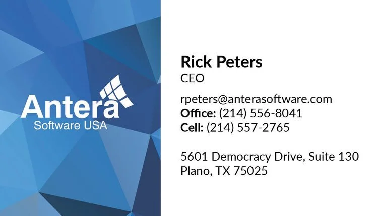 Some assets I created for Antera Software include proposal templates, website assets, and business cards.